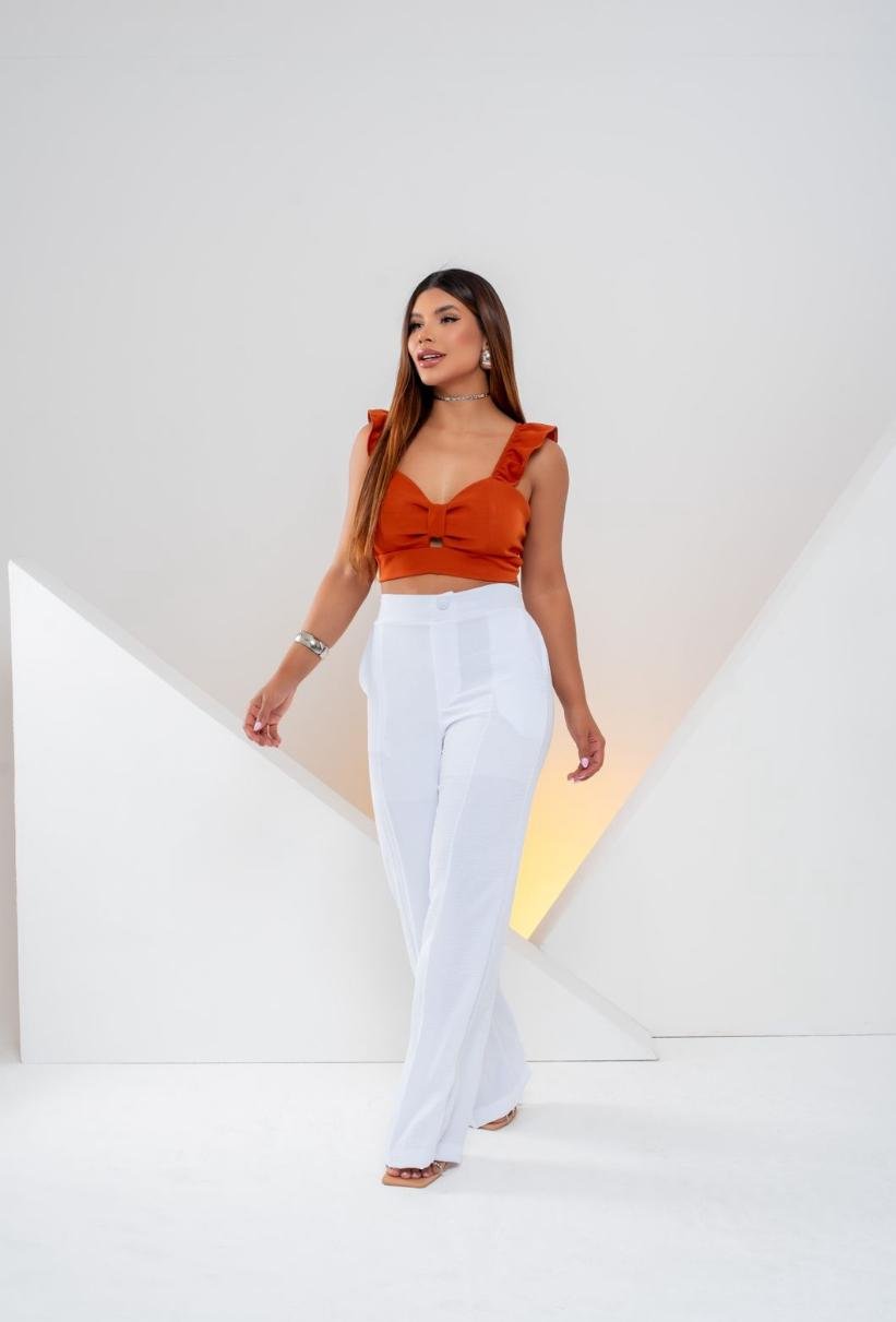 - Para um look casual chic: combine com uma blusa de seda ou cropped, sandálias de salto bloco e acessórios delicados. Perfeita para almoços, passeios ou encontros com amigas.