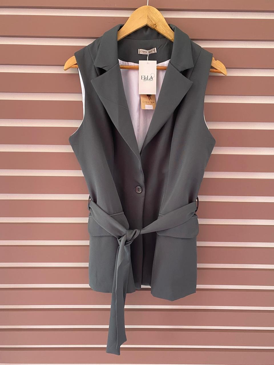 Este colete sofisticado em alfaiataria oferece um caimento alongado que valoriza a silhueta. Com uma amarração na cintura que permite ajustar para um visual mais feminino e elegante. Perfeito para quem busca uma peça versátil que combina estilo e conforto.