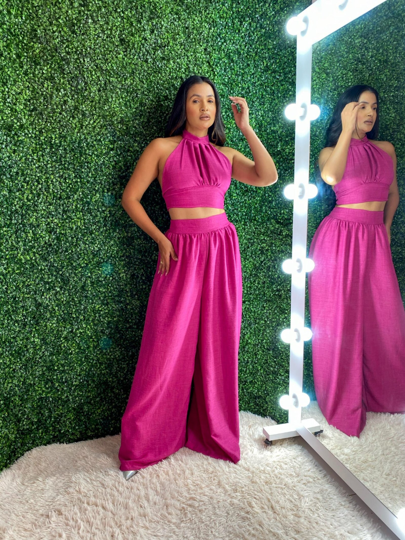 Transforme seu guarda-roupa com nosso elegante conjunto de cropped e calça pantalona. O cropped, com sua charmosa amarração nas costas, proporciona um toque moderno e sofisticado, enquanto a calça ampla e fluida garante conforto e liberdade de movimento.