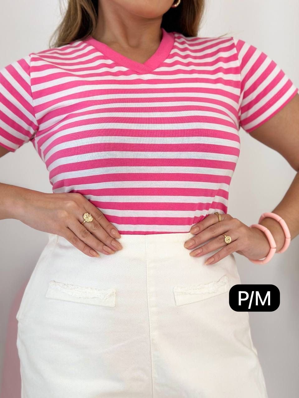 T-shirt listrada de gola V, básica e casual, perfeita para o dia a dia. Com design versátil, oferece diversas combinações de looks, proporcionando conforto e estilo em qualquer ocasião. Ideal para quem busca praticidade e elegância no guarda-roupa.
